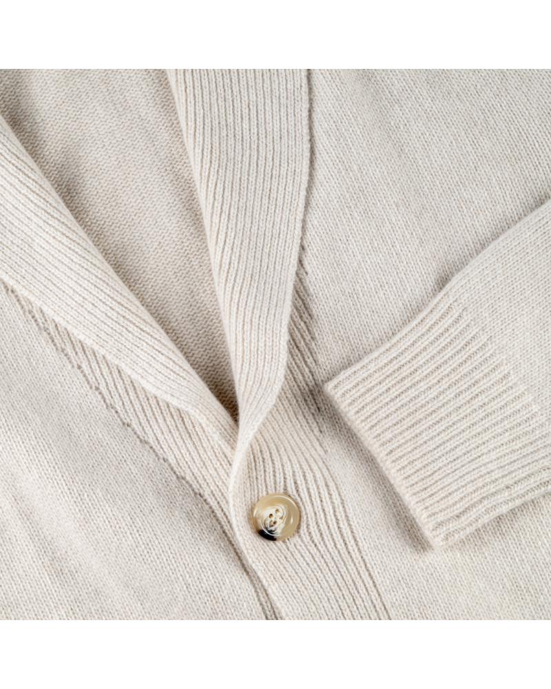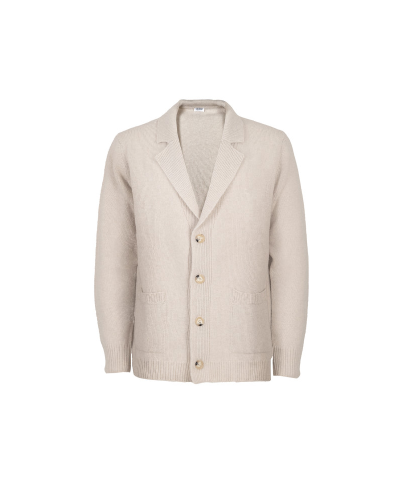 • Model: cardigan with notch lapel collar, echoing a tailored jacket.