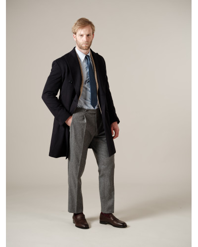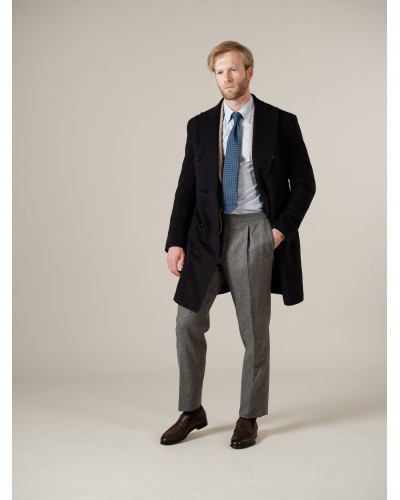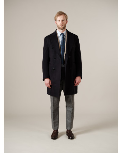 Elegante e versatile, questo cappotto doppiopetto blu navy è realizzato a Napoli utilizzando un tessuto pura lana vergine e in cashmere, che offre un grande calore e una piacevole morbidezza al tatto. Ha una costruzione morbida, revers a punta e tasche a filetto.